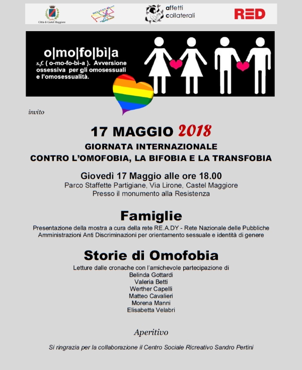 Si celebra il 17 maggio 2019 la giornata mondiale contro l'omofobia, per ricordare che 28 anni fa l'omosessualità è stata rimossa dalle malattie mentali dall'organizzazione mondiale della sanità e per esprimere il proprio rifiuto contro la discriminazione dei diritti di tutti.