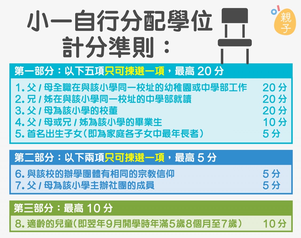 ç çµ±ä¸æ´¾ä½ç¨åºåå©éæ"»ç¥ä¸¨afterschool / 什麼是「計分類」:學校小一學額的 20% 至 50%,會根據「計分辦法準則」所計得的分數,去決定派位的優先次序,簡單來說,分數愈高,被取錄的機會愈大,用這個方法錄取的學生,叫「計分類」。 以下列出教育局規定的「計分辦法準則」的計算方法。請在甲類條件及乙類條件各選一項,便會知道你子女所得的分數。. 什麼是「計分類」:學校小一學額的 20% 至 50%,會根據「計分辦法準則」所計得的分數,去決定派位的優先次序,簡單來說,分數愈高,被取錄的機會愈大,用這個方法錄取的學生,叫「計分類」。 以下列出教育局規定的「計分辦法準則」的計算方法。請在甲類條件及乙類條件各選一項,便會知道你子女所得的分數。 雨花区务工人员随迁子女入学资料审核计分标准: 【重要提醒】 进入我们的微信公众号 长沙本地宝 (微信id:cshabdb),回复: 小升初 ,就可以获取长沙普通中小学入学报名系统入口,查看2020长沙小升初入学报名日程安排,获取详细报名指南,查看长沙城区小升初微机派位计划、方法等重要入学. (2) 根据计分办法准则分配的学位 - 由类别一分配方法剩下的配额将全部拨入此类分配方法。 在「统一派位」阶段,教育局会根据校网、家长选择及随机号码分配小一学位。有关统一派位的结果,通常於每年六月发布。 据了解, 香港的小学派位大致分两个阶段: 自行分配学位和统一分派学位。 现在完成的, 是由家长向学校递交申请表格后进行的自行分配学位。 在此阶段中,分配学位有两类情况: 必录(有兄/姊在该小学就读或父/母在该小学就职)和根据《计分办法准则》录取。