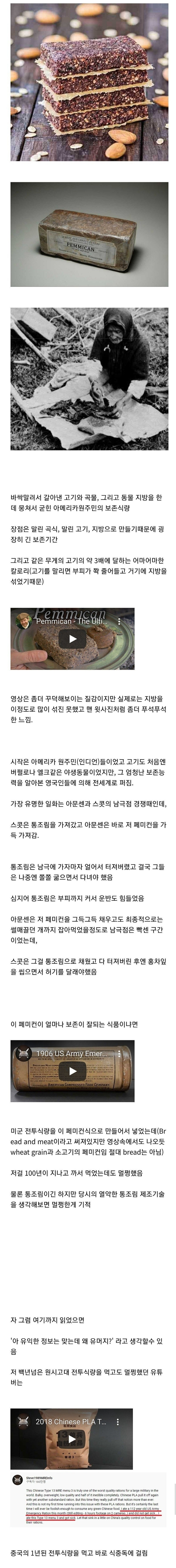 원래 개 먹이용으로 만들어 탄수화물이 전혀 없었으므로 개 페미컨(dog pemmican)이라고 불렀다. 섀클턴 탐험대가 남극에서 돌아오는 길에 조난을 당했지만, 혹독한 겨울을 이기고 살아남은 이유가 바로 페미컨 덕이었다. 페미컨(pemmican)은 북아메리카 원주민들이 처음 만든 고단백 고지방 보존음식이다. 영상은 좀더 꾸덕해보이는 질감이지만 실제로는 지방을 이정도로 많이 섞진 못했고 맨 윗사진처럼 좀더 푸석푸석한 느낌. 굳어버린 지방층이 미생물 번식이나 산소와의 접촉을 막아주기.